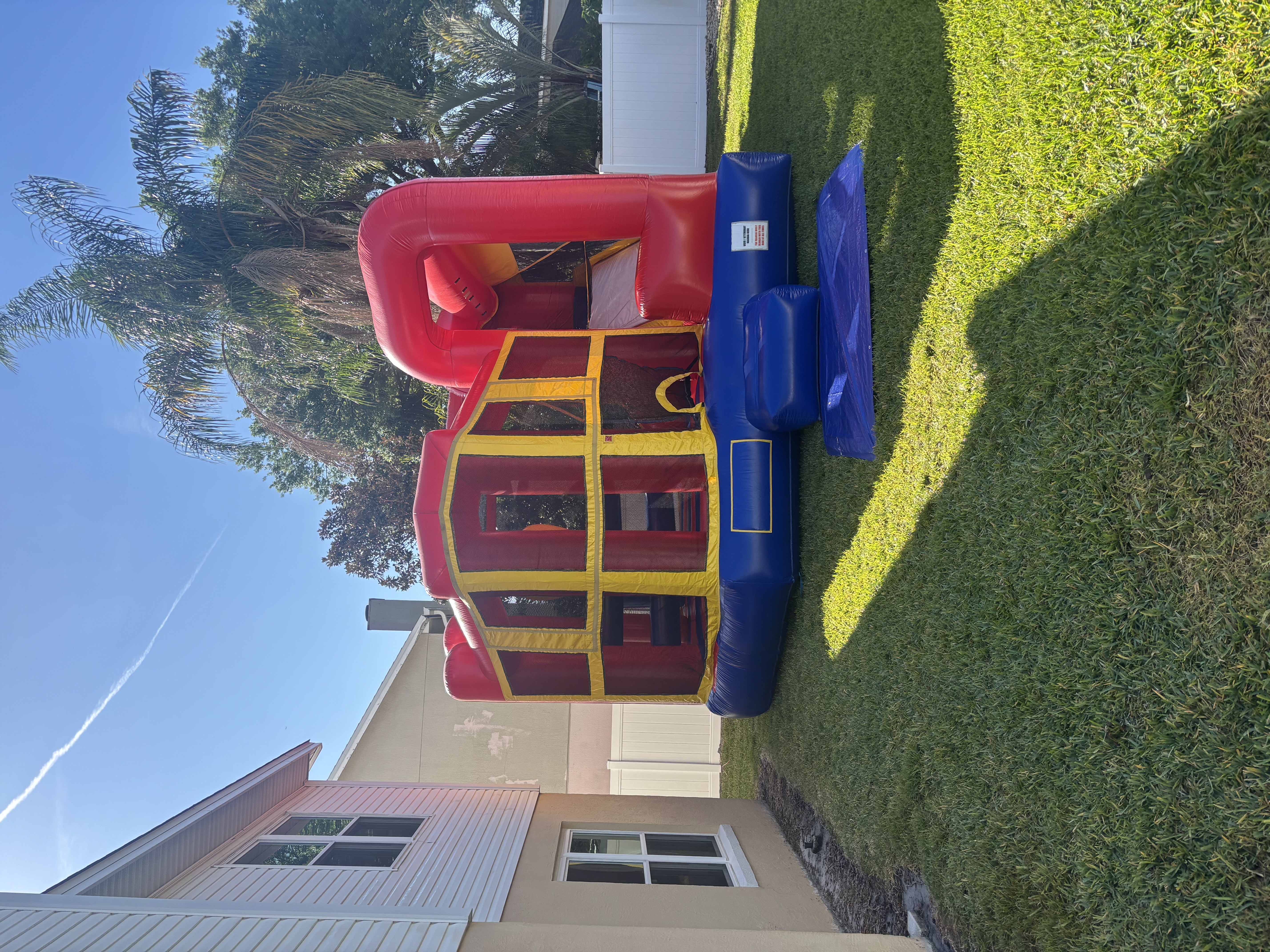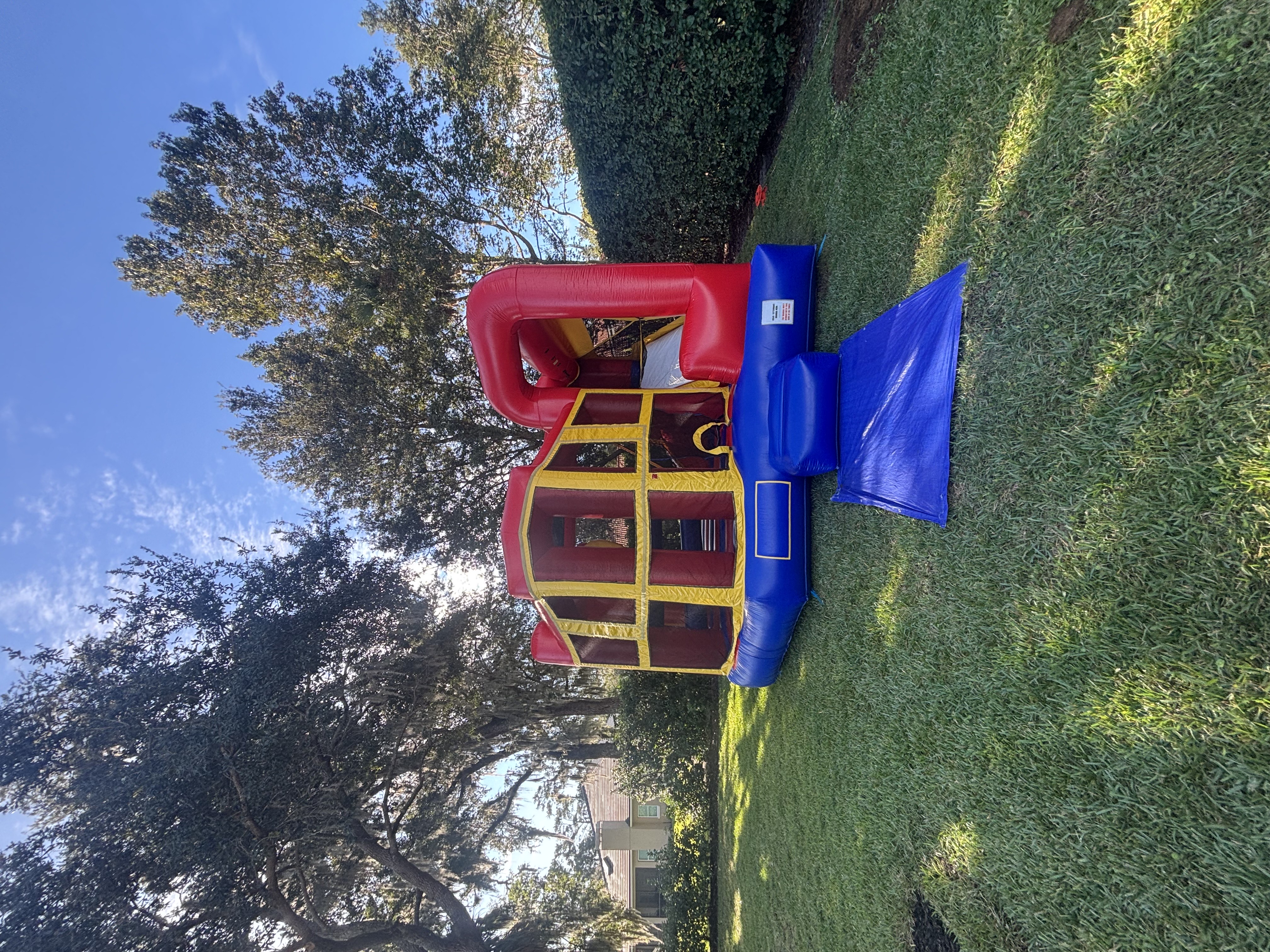 This 5 in 1 Module Combo II style bounce house is the ultimate in Inflatable jumpers. The large interior jumping area offers a basketball hoop & obstacle. This unit can be rented with a banner of your choice and can be used wet or dry. Dimensions L20’xW19’xH15’